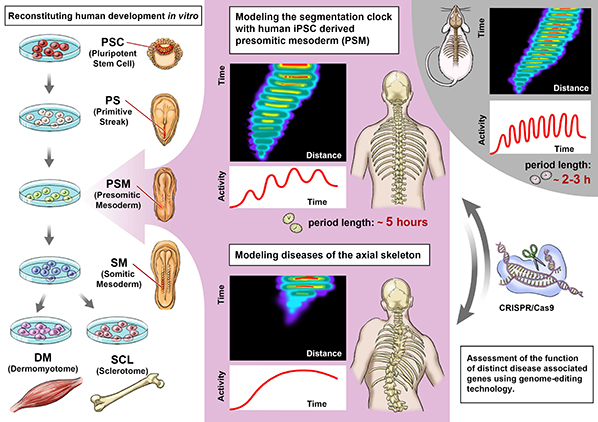 A way of addressing this problem is to reconstruct the clock using stem cells. In their paper published in Nature , a team consisting of members from ASHBi, Kyoto University's Center for iPS Cell and Research Application, and RIKEN focused on using human iPS cells to form the 'pre-somitic mesoderm', the precursor cells of somites.
