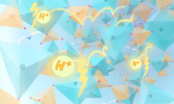 The molecular structure of the new polymer glass facilitated the movement of protons (H+) across it under dry conditions at 120°C. (Illustration by Izumi Mindy Takamiya (CC BY 4.0))