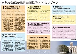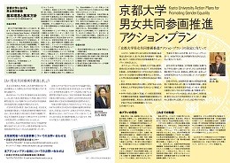 平成17年10月に設置された男女共同参画企画推進委員会では、平成19年10月に「京都大学男女共同参画推進アクション・プランに向けて(提言)」を公表し、アクション・プランに盛り込むべき内容を取りまとめた。また、男女共同参画企画推進委員会の後継組織として平成20年1月に設置された男女共同参画推進室では、平成20年3月に「男女共同参画の推進に向けて-第1期中期計画期間中の事業-」を提示しています。