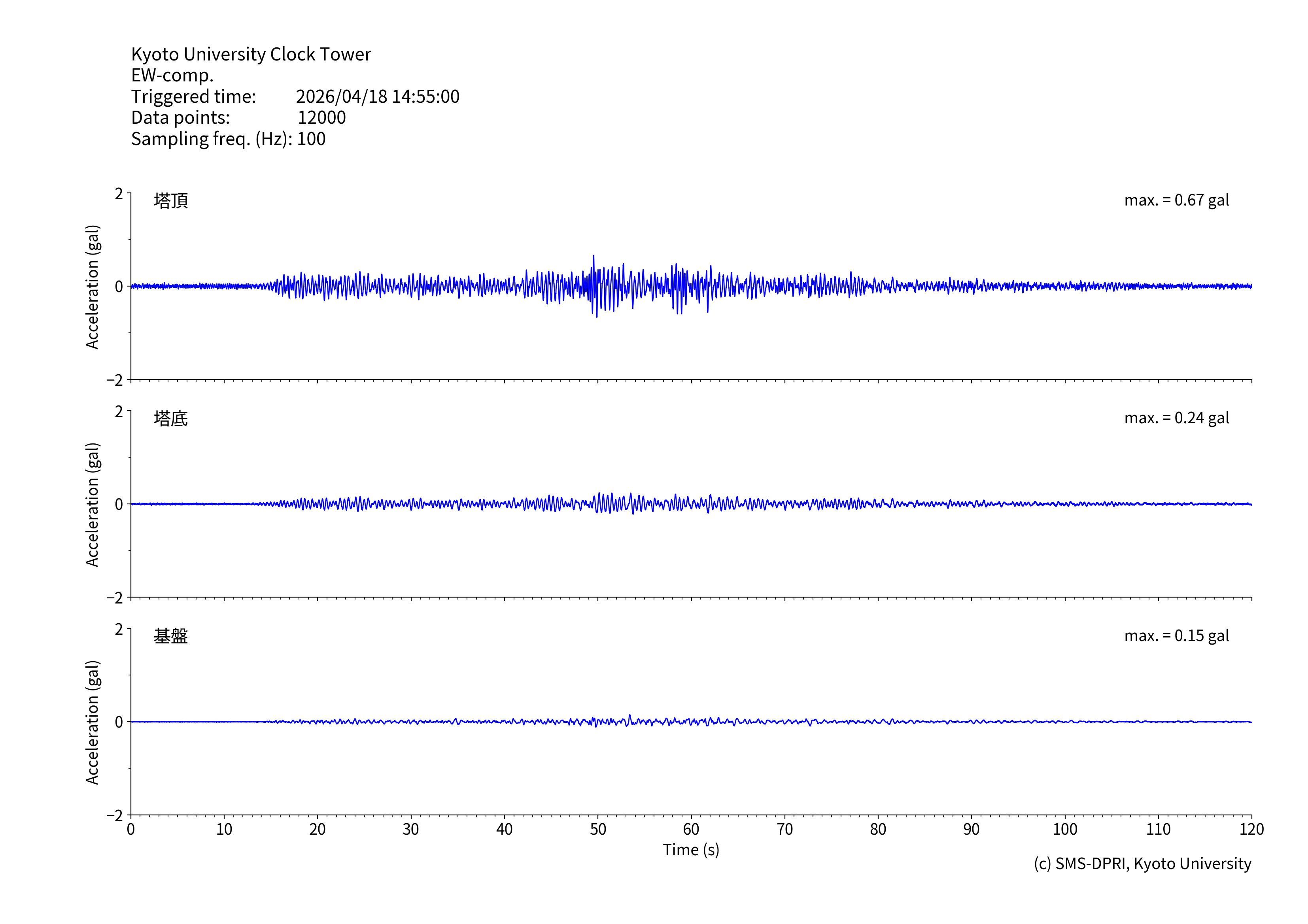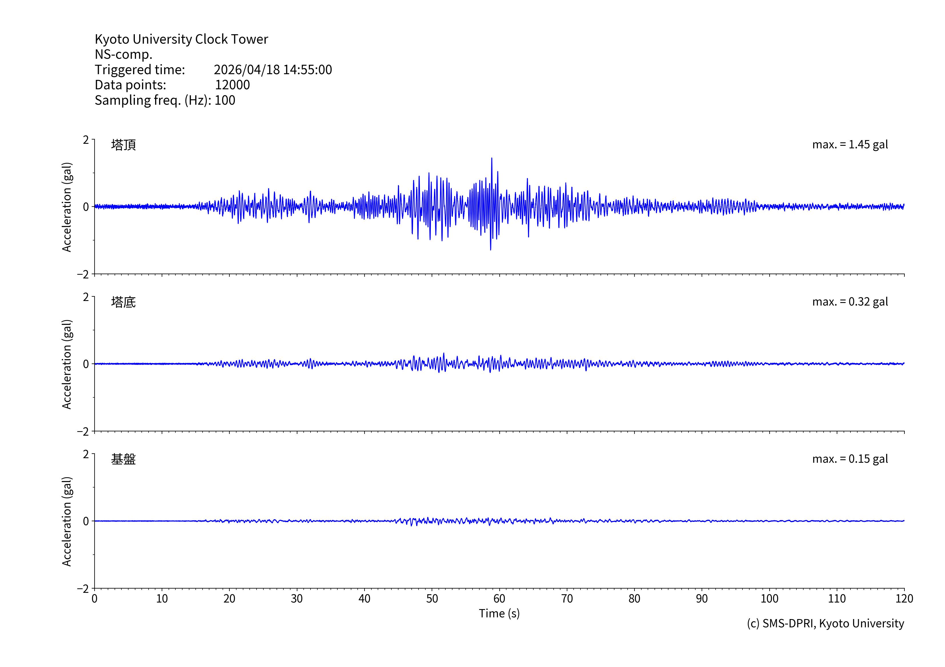 時計台記念館には、基礎地面(基盤)、建物底(塔基礎)、および時計台塔(塔頂)の3カ所に研究用の地震計が設置されています。地震計は、有感地震が起きると収録を行います。このページでは、収録された揺れの記録と計測震度相当値、およびその揺れの特徴の図面を公開しています。