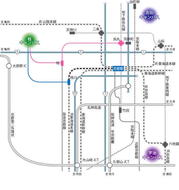 | 阪急 桂駅西口から | 京都市バス西6系統、または京阪京都バス20・20B系統で「桂坂中央」行きに乗車、「京大桂キャンパス前」バス停下車徒歩約5分 | 約15分 |