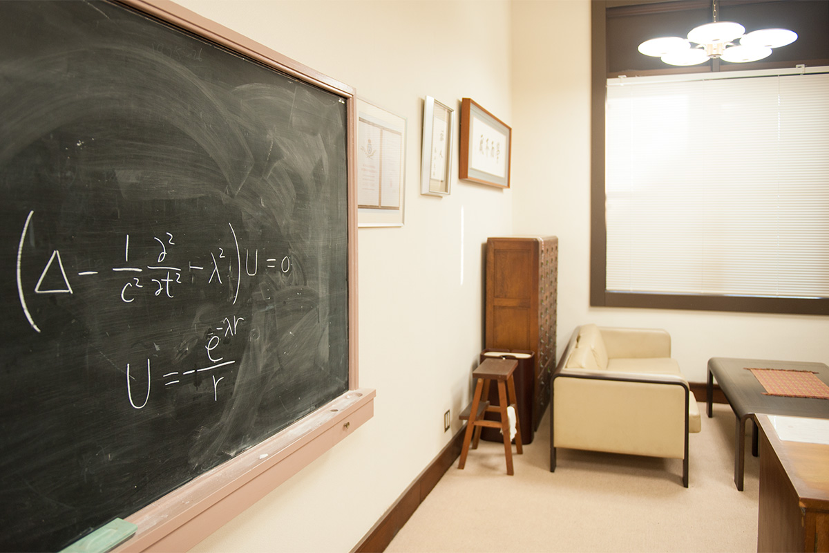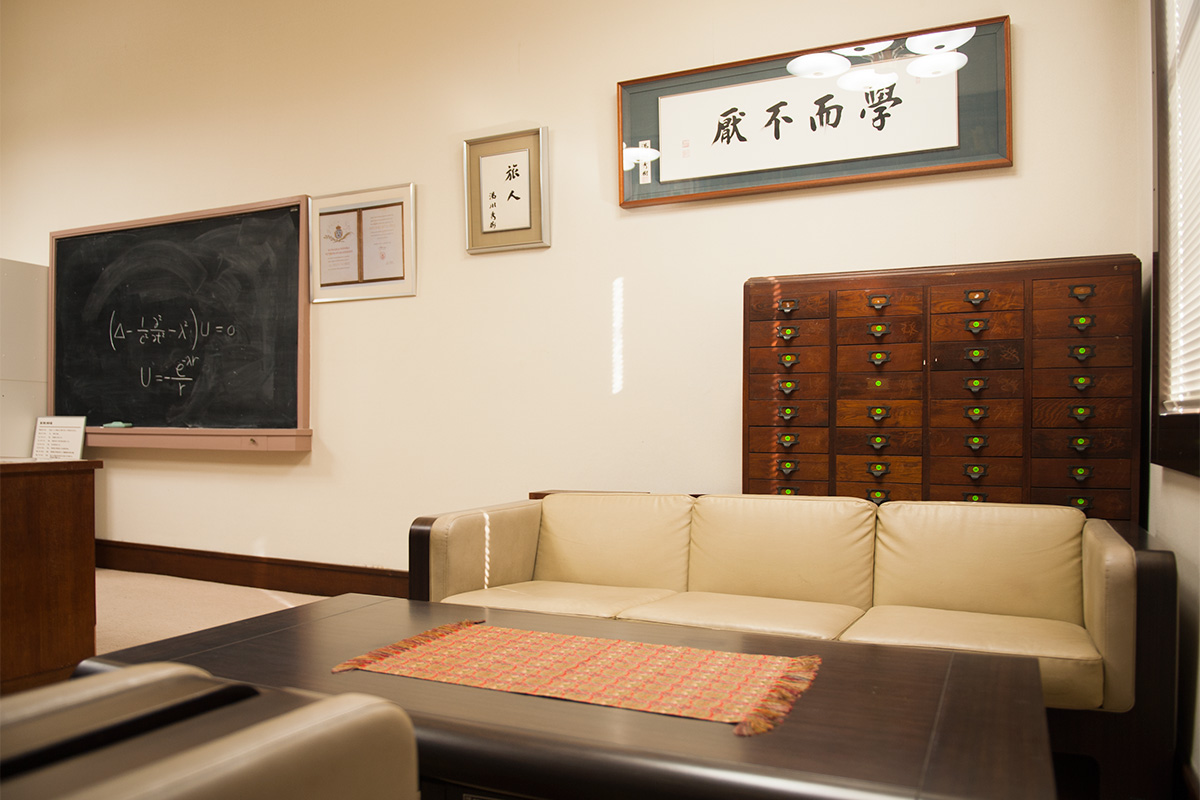 湯川教授の研究生活の面影を伝えてその偉業を偲ぶために、湯川教授が使用していた旧所長室を「湯川記念室」(Yukawa Memorial Room)として保存しています。この記念室におかれた書籍(遺著約250冊、蔵書約1,920点)および扁額は遺族より基礎物理学研究所に寄贈されたものです。