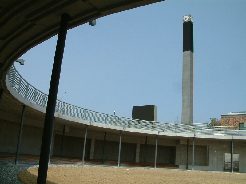 クラスターBの中央ゾーンにあって桂キャンパスの中核を成すキャンパスコミュニティー・プラザ(正面広場)の一角に、キャンパス全体の中心を象徴する桂モニュメントが屹立しています。このモニュメントは21世紀初頭の科学技術を後世に伝える役割を託して建てるもので、幅2mの矩形で高さ31mのスリムな柱状構造をしています。鋼と同程度の強度をもつプレキャストコンクリート部材を使用しており、最高部には吉田キャンパスの時計台と同じデザインの時計盤が、そのすぐ下部には青・赤・緑の発光ダイオードで構成される縦長のディスプレーがそれぞれ4面に設置されています。