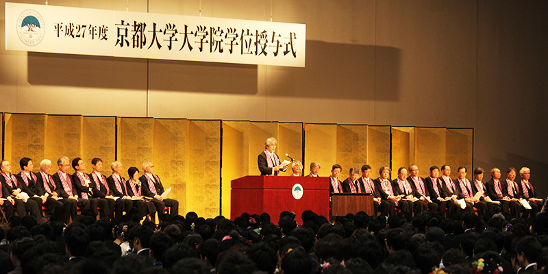 本日、京都大学から修士の学位を授与される2,113名の皆さん、修士(専門職)の学位を授与される156名の皆さん、法務博士(専門職)の学位を授与される135名の皆さん、博士の学位を授与される592名の皆さん、誠におめでとうございます。