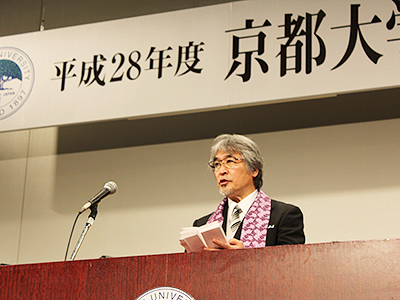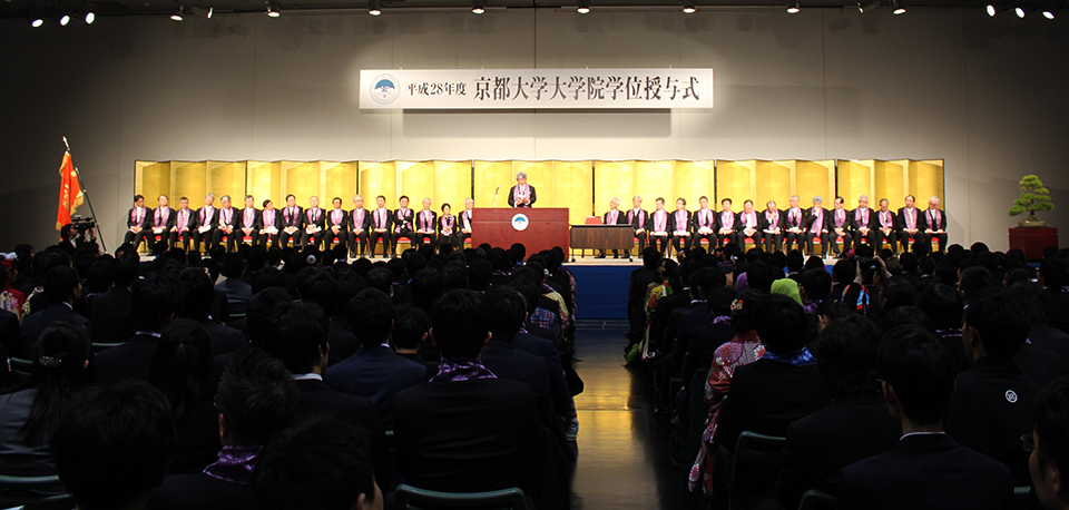 学位を授与される皆さんの中には、343名の留学生が含まれています。累計すると、京都大学が授与した修士号は76,605、修士号(専門職)は1,539、法務博士号(専門職)は1,992、博士号は43,301となります。列席の副学長、研究科長、学館長、学舎長、教育部長、研究所長、リーディングプログラムコーディネーターをはじめとする教職員一同とともに、皆さんの学位取得を心よりお祝い申し上げます。京都大学が授与する修士号や博士号には、博士(文学)のように、それぞれの学問分野が付与されており、合計24種類もあります。また、5年前からリーディング大学院プログラムが始まり、これを受講し修了された皆さんの学位記には、それが付記されています。これだけ多様な学問分野で皆さんが日夜切磋琢磨して能力を磨き、その高みへと上られたことを、私は心から誇りに思い、うれしく思います。本日の学位授与は皆さんのこれまでの努力の到達点であり、これからの人生の出発点でもあります。今日授けられた学位が、これから人生の道を切り開いていく上で大きな助けとなることを期待しています。私は総長に就任して以来、大学を社会や世界に開く窓として位置づけ、WINDOW構想を掲げてきました。大学に期待される教育、研究、社会貢献という三つの役割のうち、教育を大学全体の共通なミッションとし、有能な学生や若い研究者の能力を高め、それぞれの活躍の場へと送り出すことを全学の協力のもとに実施してきました。WINDOW構想の最初のWはWILD and WISE、野生的で賢い能力の育成を目標にしています。世界の急激な動きに左右されることなく、独創的な考えを発信しながら、自分で判断し行動できる人を育てたいと思っています。これから社会に出て行く皆さんはぜひその模範となっていただきたい。また、WINDOW構想では、女性の活躍を支援して希望のある社会を築くことを謳い、男女共同参画推進アクションプランを提示しています。本日学位を授与された皆さんの中には、726名の女性が含まれています。この数は年々増えていくことでしょう。ぜひ、ご自身の経験と能力を活かしながら、男女が分け隔てなく、楽しく働ける社会の実現へ向けて、皆さんのご活躍を期待しております。