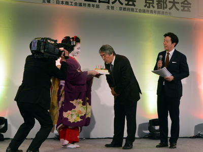 京都市勧業館「みやこめっせ」で開催された、日本商工会議所青年部主催の全国大会 京都大会に出席し、講演を行いました。本学発行の冊子や京大グッズの展示コーナーも設けました。 また当日は63歳の誕生日とあって、舞妓さんからサプライズのお祝いをしていただきました。