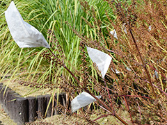 ん? この袋はなに・・・? これは、 「シソ」 の実。研究に使用する「遺伝的に純系」な種をとるために、自然交配しないように袋づけをするんですって。