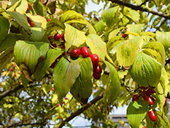 かわいらしい朱い実は 「サンシュユ」 。滋養強壮に良いのだそう。