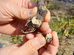 根茎の部分が使われる 「ホソバオケラ」 。殺菌作用があるので、煎じて飲んだり、くすべて煙を出したりして使います。独特のにおい。八坂神社(京都)の元旦の神事「をけら祭」のおけら火にはこれが使われるそう。