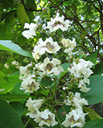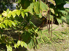 何とも不思議な、細く垂れ下がっている実は 「キササゲ」 。利尿作用があり、腎臓病に効くとされています。