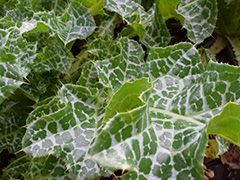 「マリアアザミ」 。名前に反して、葉は鋭いトゲに覆われています。これがかなり痛い!肝臓疾患に効くため、お酒呑みの強い味方。