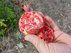 割ると鮮やかな実が現れる 「ザクロ」 。もぎたてを食べさせていただきました。程よい酸味が美味しい! ザクロも生薬だとは知らなかった!