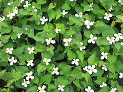 かわいらしいドクダミの花。開花期の地上部を乾燥させたものは、「十薬」または「重薬」と呼ばれ、十の効能を持つ重要な薬といわれています。煎じてお茶にするのが一般的。