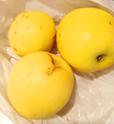 カリン3個あたり、1kg程度のはちみつを使います。もぎたてのカリンはいい香り。