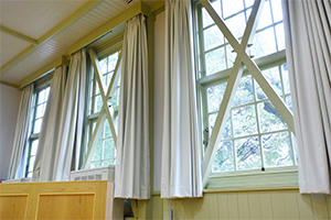昔の机には立派な木製の幕板が付いていて、これが階段教室の雰囲気を大きく決めていました。そこで、造り付けで幕板のある木製机を持つ階段教室はないかとあれこれ探していたところ、某大学に有名建築家が設計した昭和初期のもの(復元)があるという情報をキャッチ。早速見学させてもらうと、まさにイメージにぴったり! 1日がかりで寸法などを調べ上げ、写真を撮り、そのデータを設計に反映。それをもとに大工さんが手仕事で一つ一つ作り、完成したのが今の机と椅子なんだそう。このような徹底したこだわりがあってこそ、改修後の今でも当時の雰囲気が息づいているのですね!