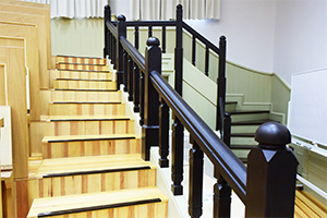 手すりは、当時の部材を取り外して補修して再現。色もできるだけ当時に近い雰囲気を意識したそう。