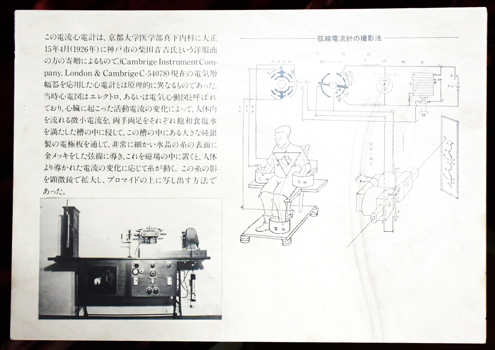 大正15年に神戸の洋服商「柴田音吉氏」によって寄贈された、ケンブリッジ社製の心電図。パッと見ただけでは心電図とはわからないですね・・・