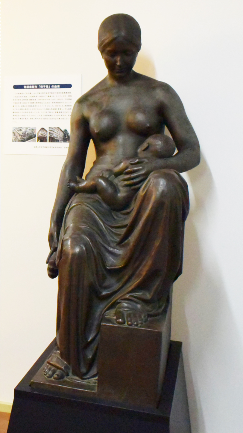 日本での産婦人科黎明期に作られた新設の産婦人科病棟にシンボルとして飾られた貴重な母子像(芸術院会員 斉藤素厳 制作)。斉藤素厳氏といえば、実は、時計台記念館正面玄関上部に掲げられているブロンズのレリーフ「雲」も同氏作。こちらも京大を代表するシンボルの一つです。