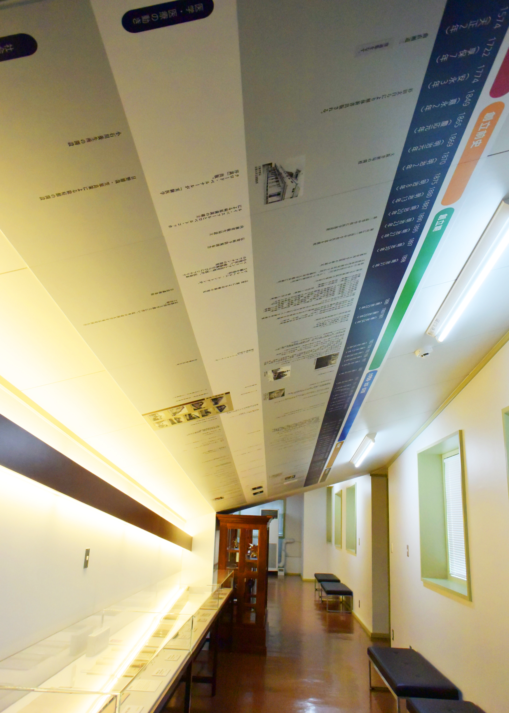 階段教室の裏側が展示スペースに。天井は医学部年表になっており、設置されているベンチで座りながら見られるつくり。建物の構造上、部分的に天井がへこんでいるところなども、講堂ならではの風情です。