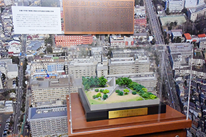 京都大学原爆災害総合研究調査班遭難記念碑(模型)。広島への原子爆弾投下の後、診療、調査研究に赴いた調査班が、滞在先の大野陸軍病院で枕崎台風による山津波に襲われ、医学部・理学部の教官・学生11名が多くの患者と共に犠牲となりました。その冥福を祈るために、昭和45年、現地に記念碑を建立し、毎年9月には慰霊祭を行っています。