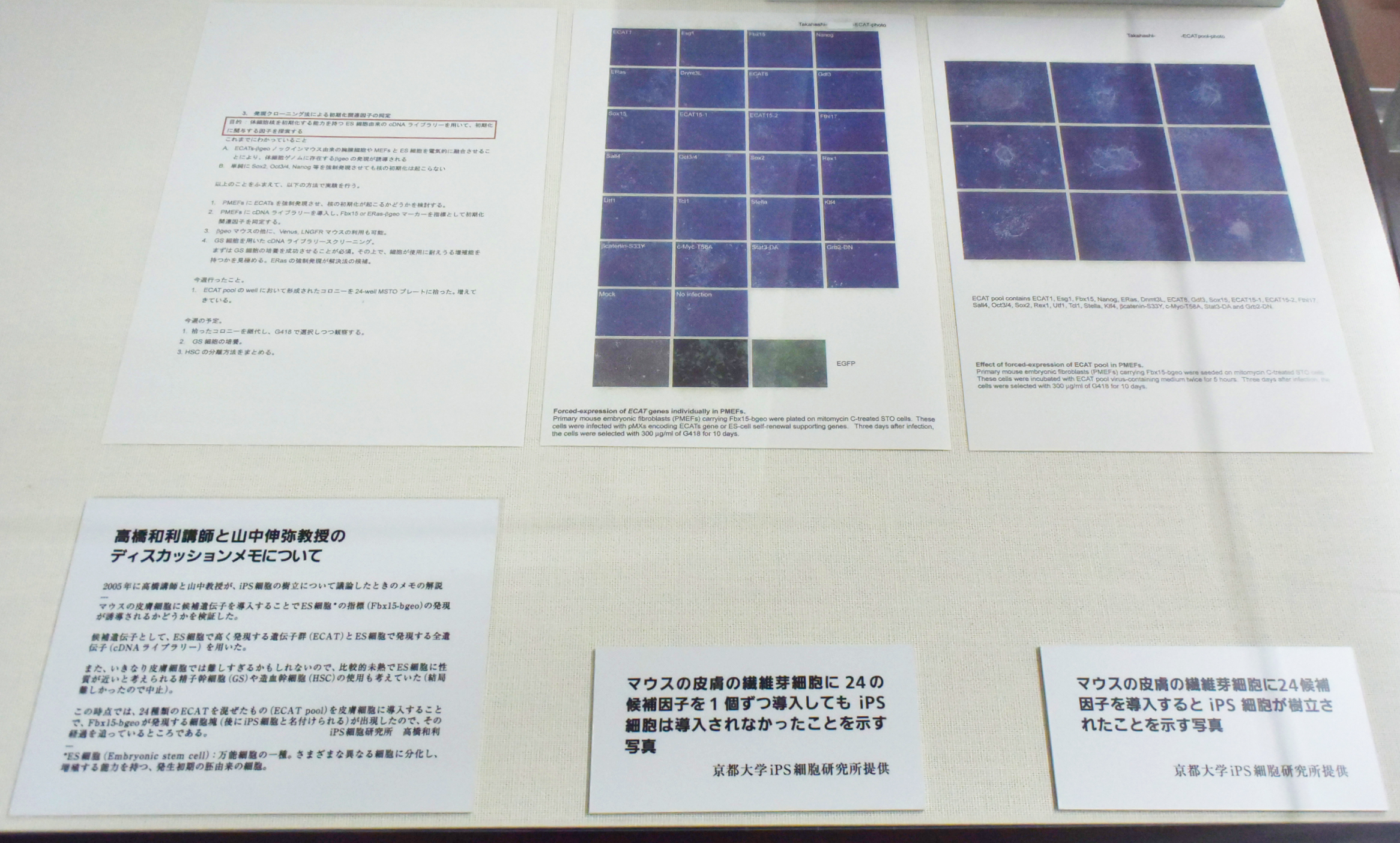 山中伸弥教授と高橋和利講師のディスカッションメモと資料。2005年にiPS細胞の樹立に成功した、まさにその瞬間の貴重な資料で、樹立が確認され、次の実験段階について記されています。やはり、こうしてきっちりと実験内容を残すことが大事なんですね!