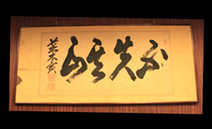 エントランスを入ると、まず出迎えてくれるのが、第7代総長 荒木寅三郎先生の胸像と先生による「不失其正」の書です。