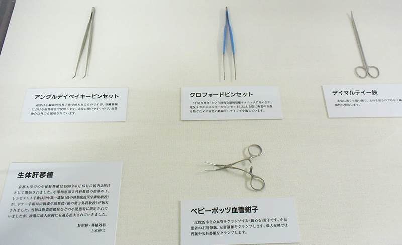 生体肝移植用の手術器具。現在では小型化されたものも多いですが、今でも変わらぬ形状で使われているものも。すべて1点モノのオーダーメイドのため、とても貴重なものだそうです。