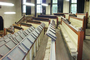 改修前、階段教室には明治時代に作られた造り付けの机と椅子が設置されていました。昔の机は前後幅が狭く、今の学生の体格に合わない事情もあり、今回の改修を機会に作り直すことに。