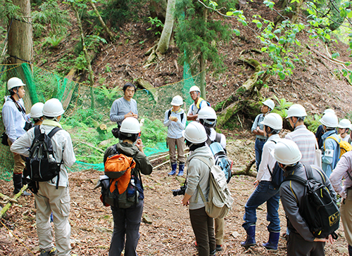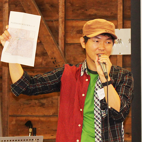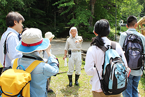 芦生研究林の土地は、地元から99年契約で借り受けているため、まもなく迎える契約更新までに「本当に価値のある研究林にしたい」という伊勢林長。そのために、自然科学の分野だけでなく、地域振興などの社会科学・芸術や哲学などの人文科学・・・など、もっと多方面での活用の可能性をみつけてほしい!というメッセージを、ツアー参加者に向けて語りました。
