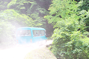 長治谷は、ここから車でさらに1時間近く走らせて登っていく山深いところ。砂煙をあげながら、狭い山道をどんどんあがっていきます。周囲の景色が変わっていくのがわかります。