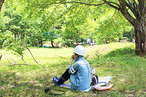 自然に癒やされながらおにぎりを食べるご機嫌な広報B。