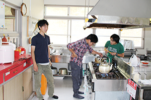 この日は、京大野生生物研究会の学生たちが、サークル合宿をしていましたよ。男子オンリーでパスタ作りに悪戦苦闘中。