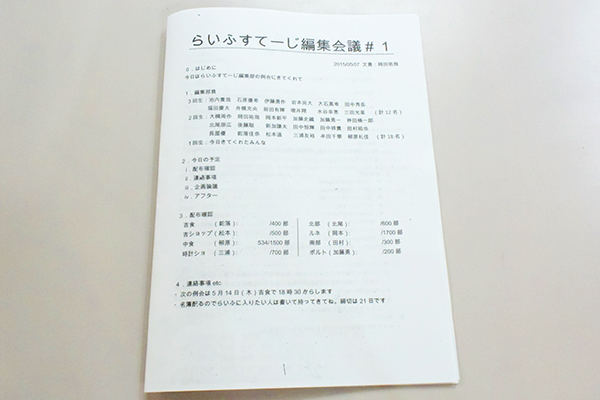 - 翌月の第一土曜日に「執筆集中」。部員全員が部室に集まって、一気に執筆作業&校閲作業。自宅に持ち帰ってやるのではなく、この「集中」でやるのがらいふ流。みんなに必ずチェックしてもらい、客観的な目線での校正を。