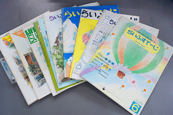 創刊当初のらいふすてーじ(最前が創刊号)。確かに、題字もデザインテイストもバラバラです。当時の表紙は、絵の上手な生協職員さんが手描きで描くことが多かったそうです。