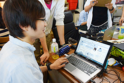 「入部したての頃は使ったこともなかった!」という増井翔くん(薬学部3回生)。インデザインも今ではこのとおりベテランの域。