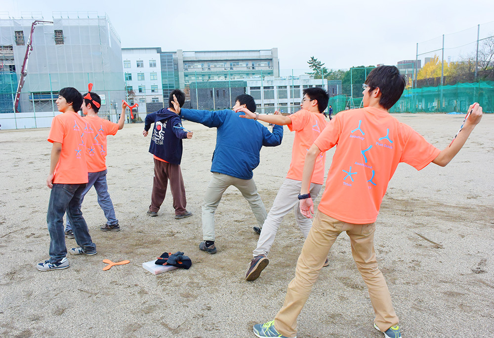 「く」は、ブーメランに興味をもっていた天野琢也さん(総合人間学部卒)によって2004年に創設されました。設立の際に、青山秀明 理学研究科教授(現サークル顧問)の全学共通科目「力学続論」でブーメランの力学的な原理が取り上げられたことから、顧問就任を依頼したそうです。