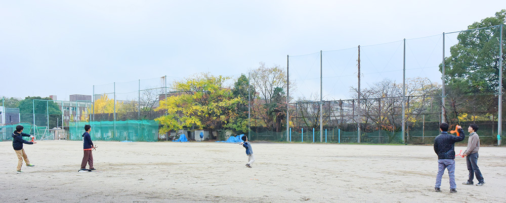 普段、構内での練習では肩身の狭い「く」なので、月に何度かは広いスペースに遠征して思う存分投げる練習をしています。この日は「淀川河川敷投げ」。その他「奈良投げ」や「宇治投げ」など、そこに広場があるかぎり、さまざまな場所で投げて投げて投げまくります。