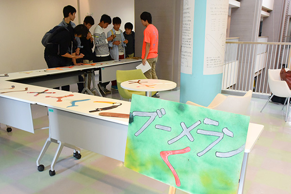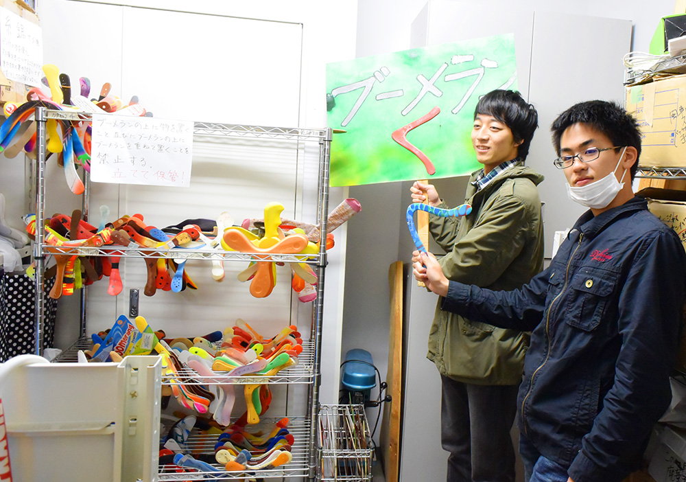 倉庫に保管されているブーメランを展示し、ブーメランの歴史や競技、原理の説明を行いました。