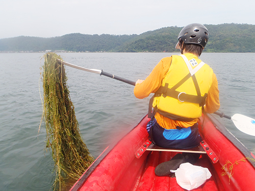 パドルに引っかかった水草に興味津々(?)