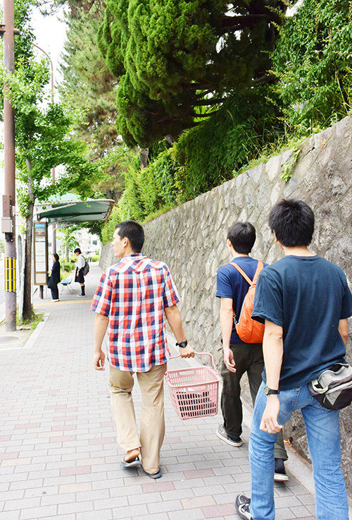 採集する植物名を書いたプラスチック容器と、採った植物を入れるカゴをぶら下げて、まずは北部構内へ出発。