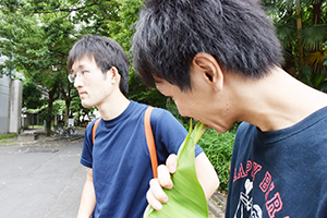 巨大なバショウの葉っぱの茎の部分を切ると、きゅうりのにおいが。思わずかじる(笑)。「これ、きゅうりのおひたしにしたら美味しいね」という広報Bの冗談に全員賛同。