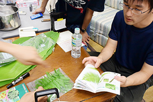 図書館から借りてきた図鑑などの資料とにらめっこしながら、採集した植物の同定作業を行います。図鑑でわからない時はスマホでささっと検索するところは現代の探検部ですね~。