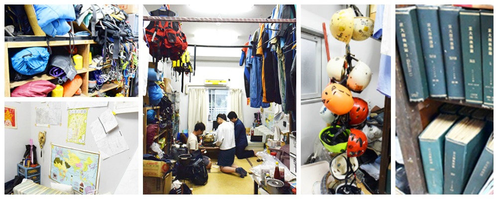 部室に入ると、たくさんの探検グッズが所狭しと置かれています。広いジャンルをカバーする探検部らしく、登山道具にキャンプ道具、ライフジャケットまで、あらゆるものが。60年の歴史を物語る歴代の「ルーム日誌」や、代々のOBの古い資料等もたくさん!そしてモノに埋もれた部員たち(笑)