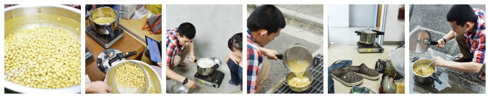 たっぷり水をふくませた大豆を茹でた後に圧力鍋へ。爆発の恐れがあるとの判断で、鍋は部室入り口に設置。そして・・・見込みどおり、最後は若干爆発(笑)。周囲が水浸しになるアクシデントもありつつ、豆はふっくら蒸し上がりました~。