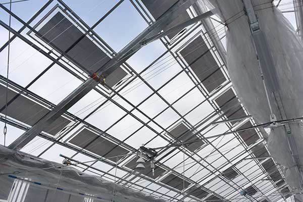 正体は、 有機薄膜太陽電池(OPV) !光を通し、フィルム状なので軽量かつ柔軟。作物を育てつつ発電もできるのです!この温室で実証実験をしているところ。