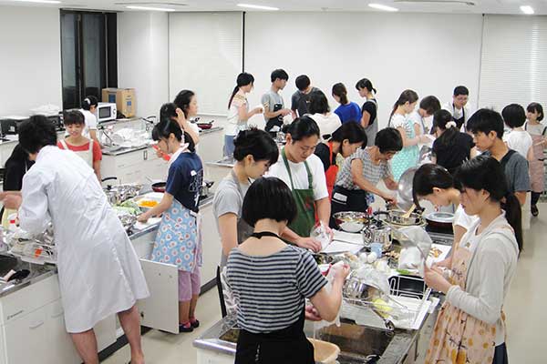 同じく「食卓の栽培学と実習」での調理風景。広い調理室を使い、みんなで協力して食事の準備。