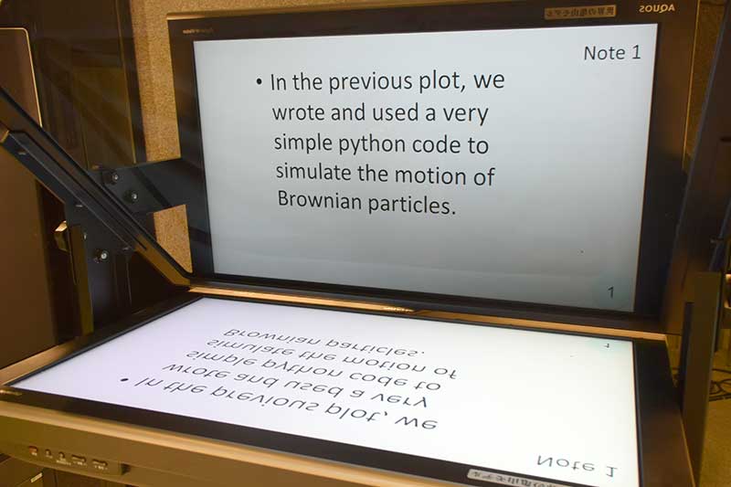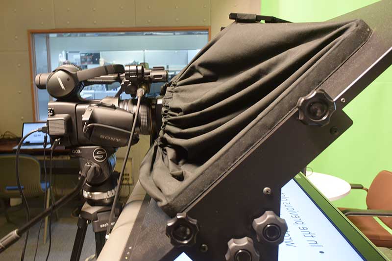 向かいには、スクリプトを写す 「プロンプター」 が(ただのカンペではありません!)。
