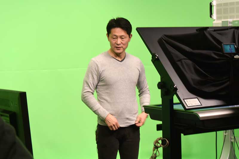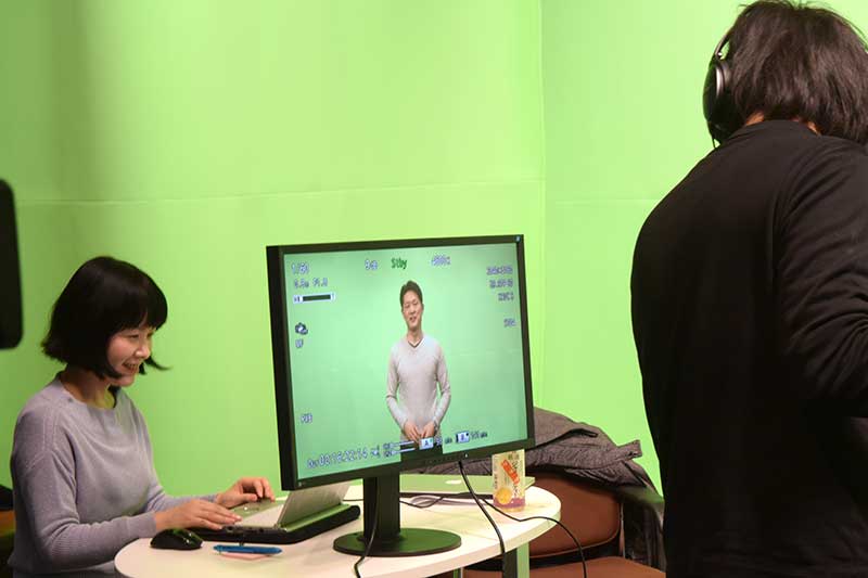 講義を撮り終えた後は、講義開始1週間前に配信するPR動画を撮影!グリーンバックに変えて撮影し、後ほど別撮りした背景を合成します。