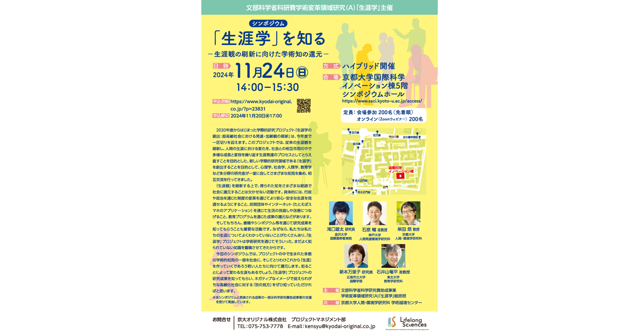 学際的プロジェクトの中で生まれた多数の学術的知見の一部を社会に、そしてこれから「生涯」を作っていく若い人たちに向けて還元することを目的にシンポジウムを開催します。「生涯学」プロジェクトの研究成果を知ってもらい、ネガティブなイメージで捉えられがちな高齢化社会に対する「別の見方」を発見してみてください。