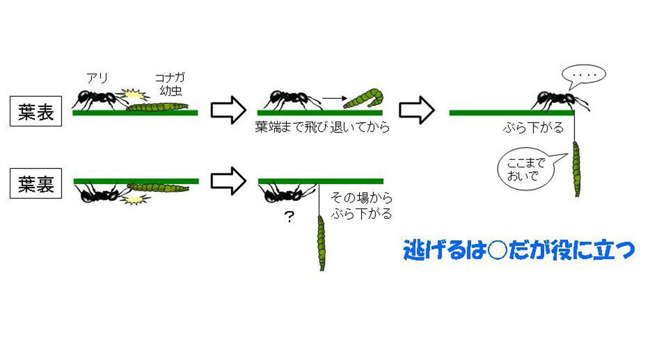 芋虫がアリの攻撃を避ける連続曲芸技を発見―飼育容器内で観察してもわからない現象の例―